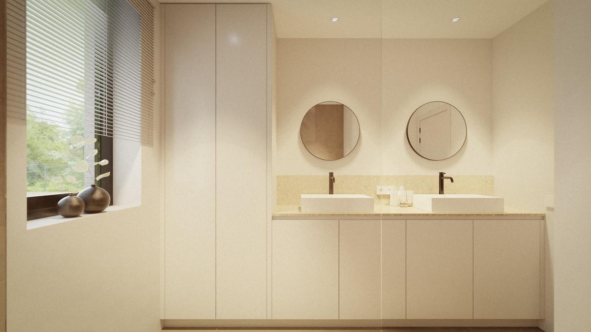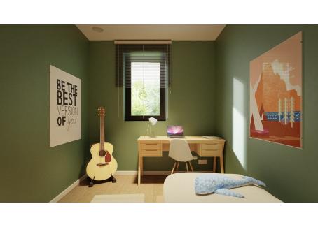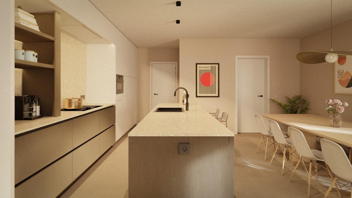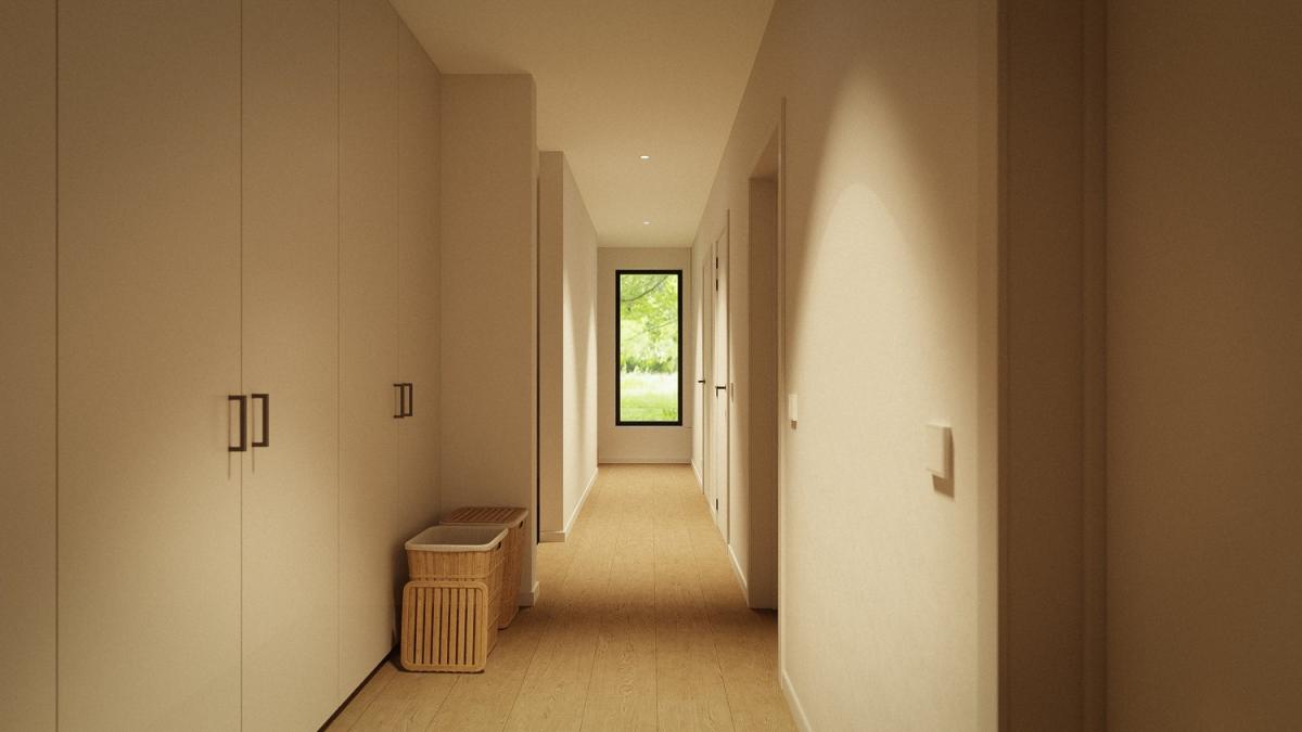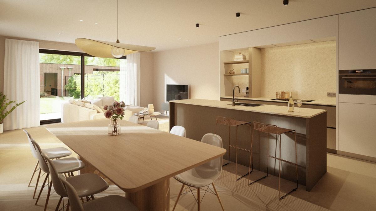 Elke woning beschikt over een privatieve tuin, achteraan toegankelijk, met de mogelijkheid tot het voorzien van een carport met berging. De lichtrijke leefruimte met open keuken vormt het centrale hart van de woning. Op het gelijkvloers bevinden zich tevens een bureau, wasplaats, berging en een apart toilet.
