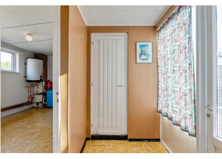 Gelijkvloers: inkomhal, gezellige leefruimte, keuken, slaapkamer, berging, gastentoilet.