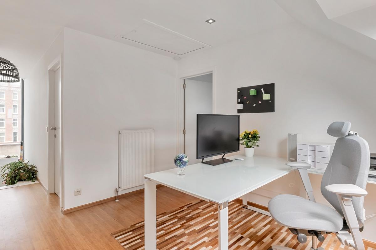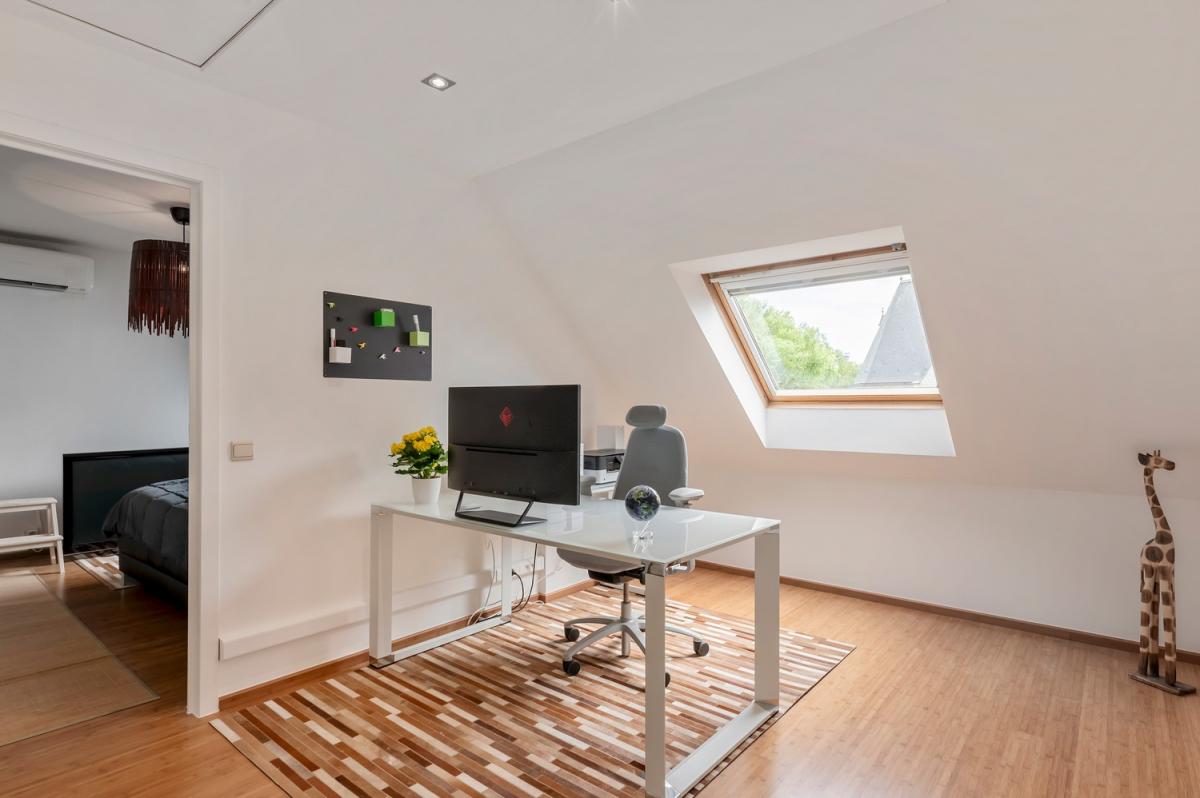Op de recent gerenoveerde bovenverdieping vind je een badkamer, twee ruime slaapkamers waarvan één met dressing, en een aparte bureauruimte.